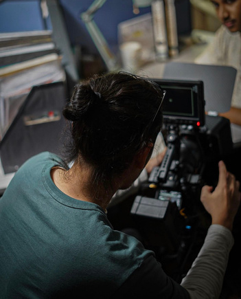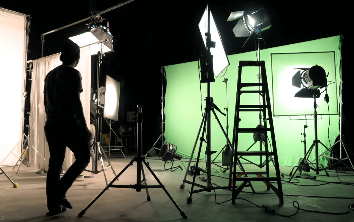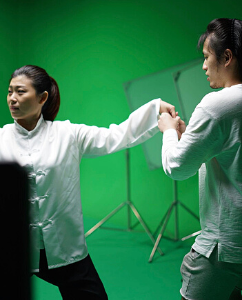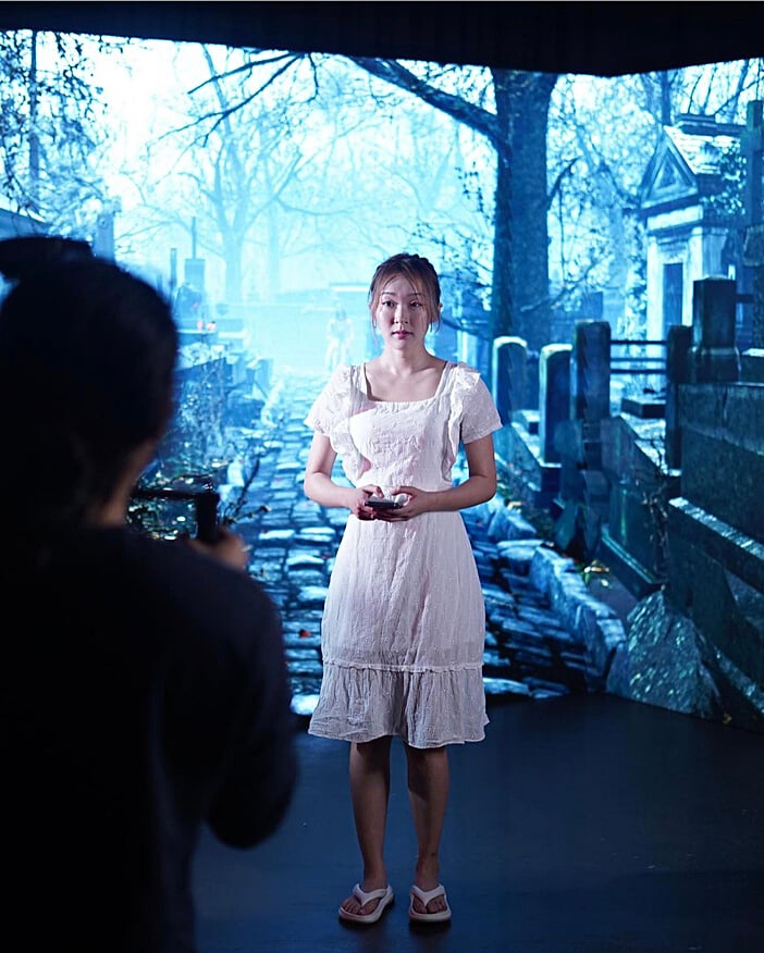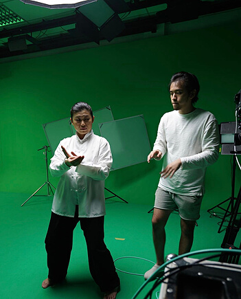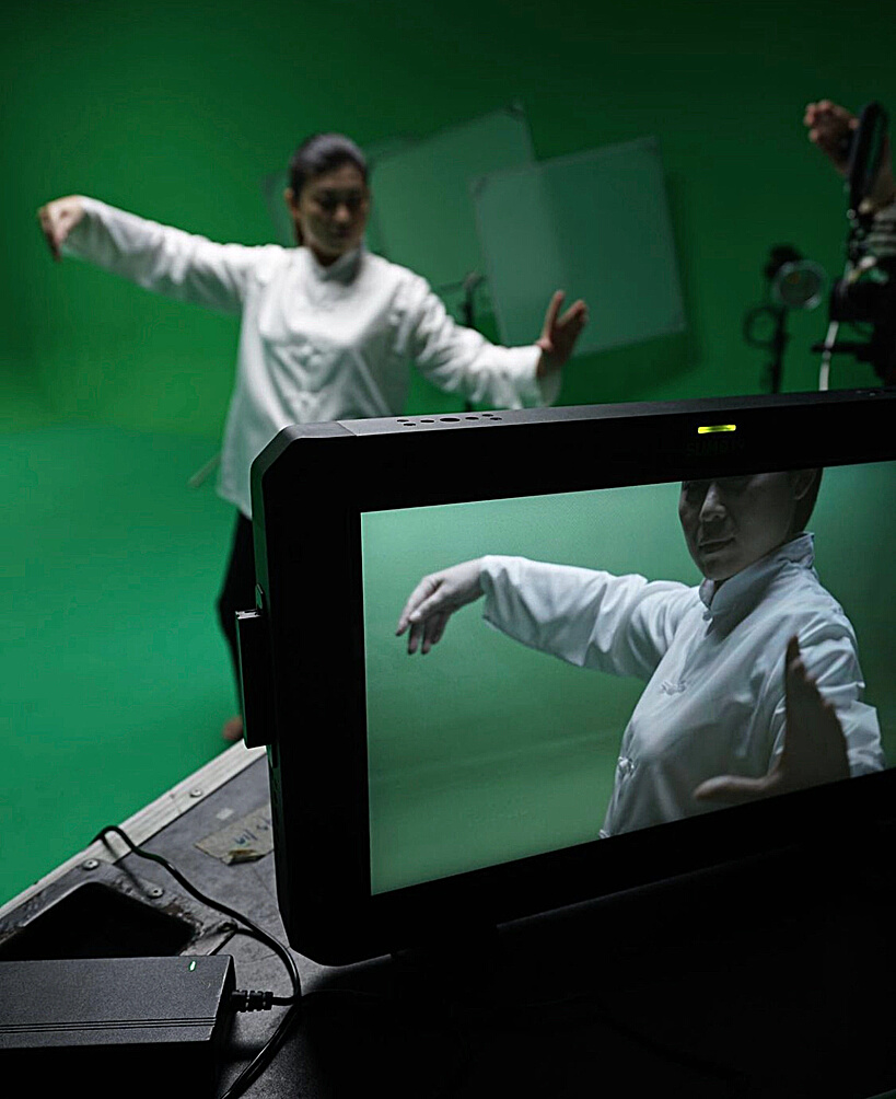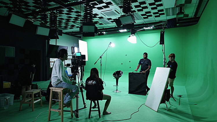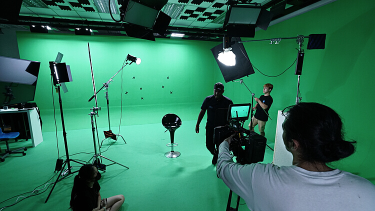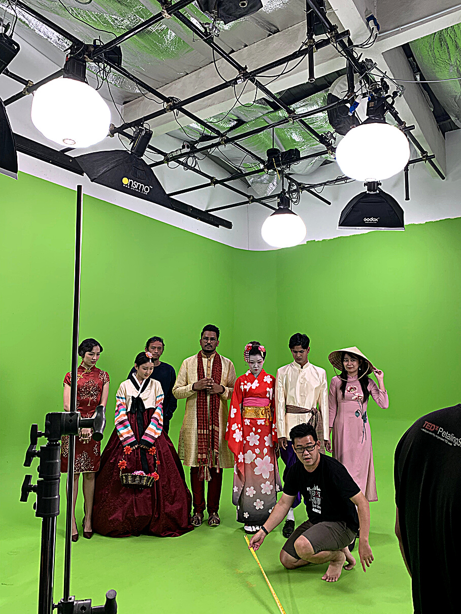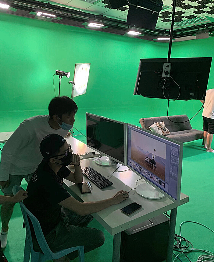 We combine virtual and physical world to create videos. We use green screen in the background of a shot, this will enable us to add visual effects in the post production. In some cases we create virtual set digitally in 3D using modelling software, then project it on to the LED screen as virtual world's background for filming.